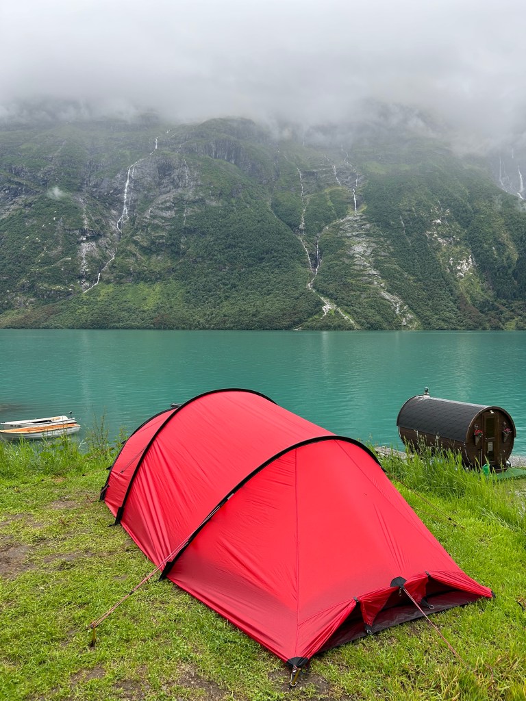 Next stop: Loen, where we stayed at Helset Camping. This has to be one of the most idyllic campings I’ve ever seen. Right by the water, surrounded by mountains, and with a sauna directly on the shore that you can book privately.